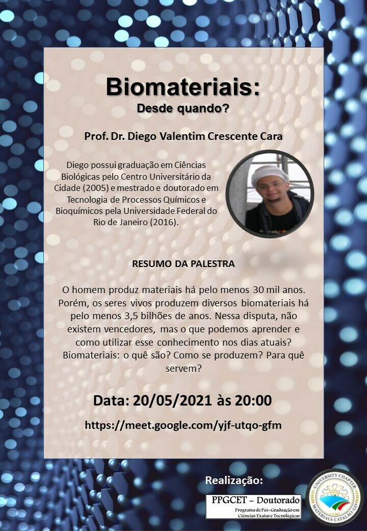 A coordenação do PPGCET convida a todos para participação na palestra intitulada "Biomateriais: desde quando?", a ser ministrada pelo Prof. Dr. Diego Valentim Crescente Cara. Haverá emissão de certificados. Link para a palestra https://meet.google.com/yjf-utqo-gfm