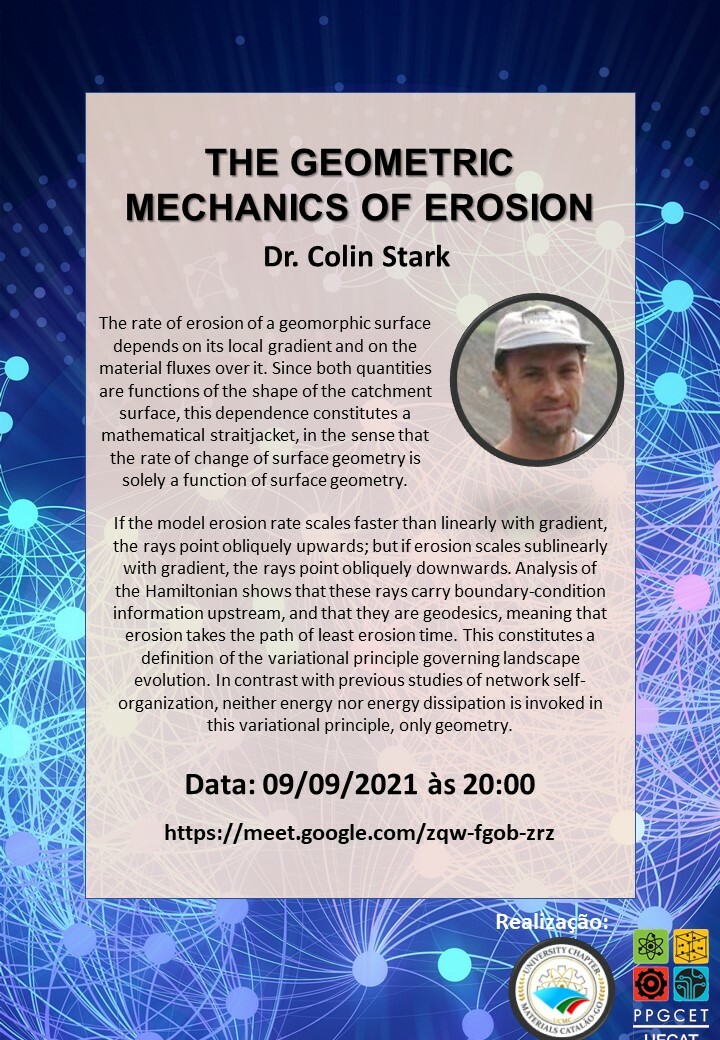 A coordenação do PPGCET convida a todos para participação na palestra intitulada "The Geometric Mechanics of Erosion", a ser ministrada pelo Prof. Dr. Colin Stark. Haverá emissão de certificados. Link para a palestra https://meet.google.com/erd-uwqh-xiz