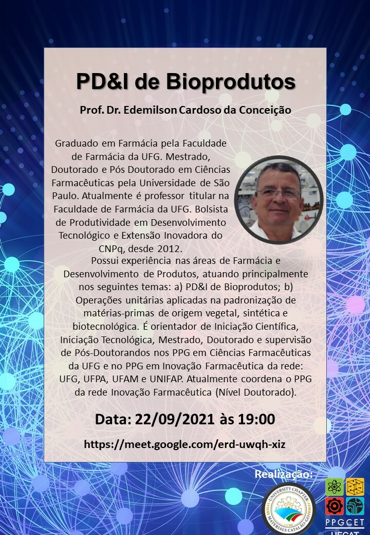 A coordenação do PPGCET convida a todos para participação na palestra intitulada "PD&I de Bioprodutos", a ser ministrada pelo Prof. Dr. Edemilson Cardoso da Conceição. Haverá emissão de certificados. Link para a palestra https://meet.google.com/erd-uwqh-xiz