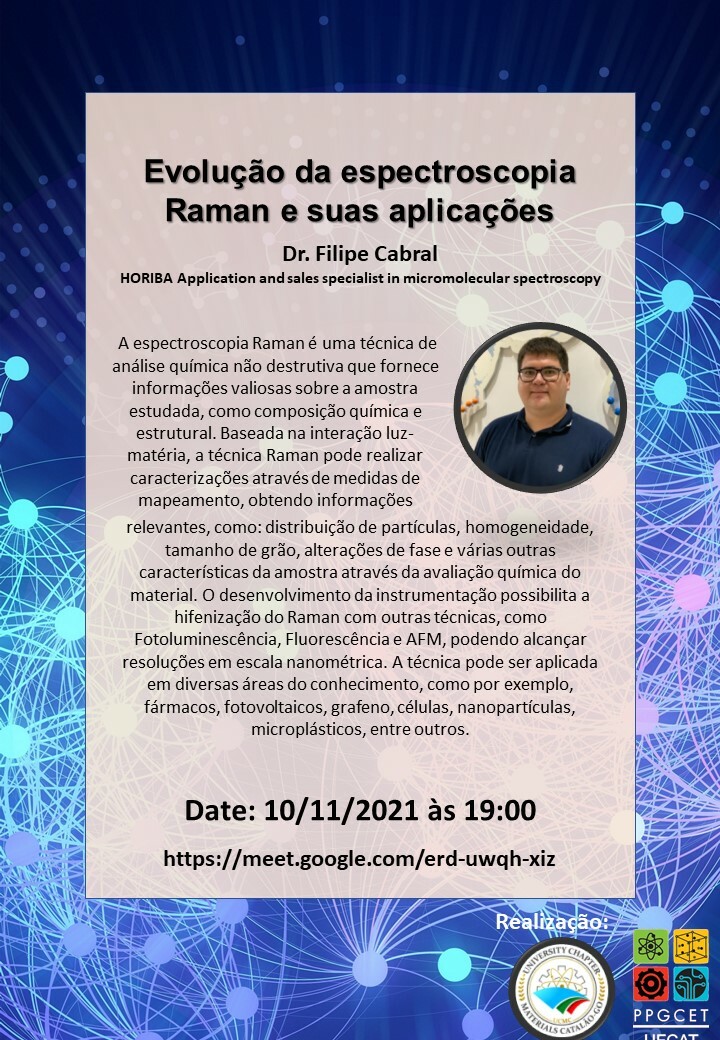 A coordenação do PPGCET convida a todos para participação na palestra intitulada "Evolução da espectroscopia Raman e suas aplicações", a ser ministrada pelo Dr. Filipe Cabral (HORIBA). Haverá emissão de certificados. Link para a palestra https://meet.google.com/erd-uwqh-xiz