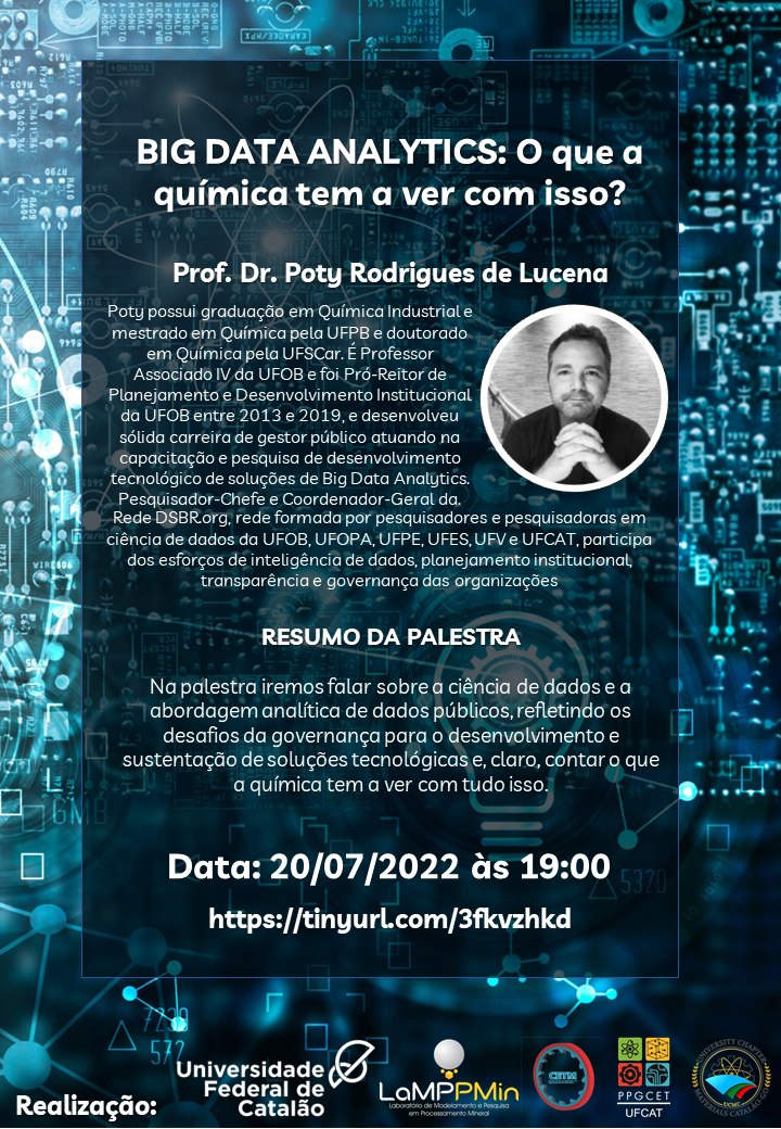 A coordenação do Curso de Especialização em Tratamento de Minérios (CETM), Laboratório de Modelamento e Pesquisa em Processamento Mineral (LaMPPMin) e do Programa de Pós-graduação em Ciências Exatas e Tecnológicas (PPGCET), convida a todos para participarem da palestra intitulada "Big Data Analytics: O que a química tem a ver com isso?", a ser ministrada pelo Prof. Dr. Poty Rodrigues de Lucena. Haverá emissão de certificados. Link para a palestra https://tinyurl.com/3fkvzhkd
