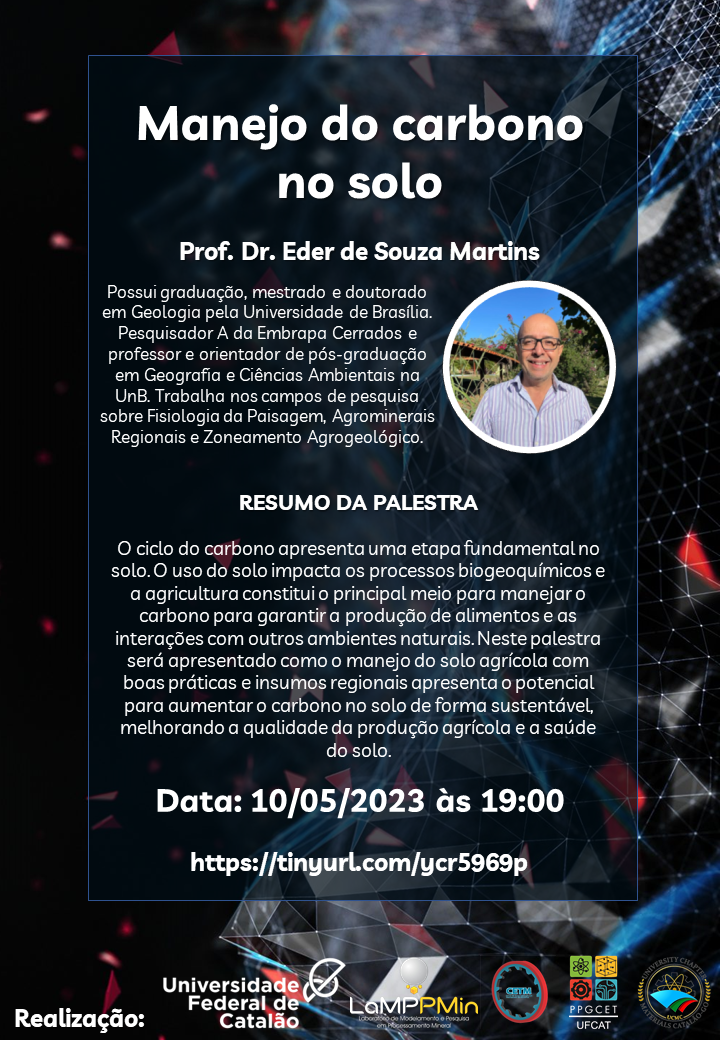 A coordenação do Curso de Especialização em Tratamento de Minérios (CETM), Laboratório de Modelamento e Pesquisa em Processamento Mineral (LaMPPMin) e do Programa de Pós-graduação em Ciências Exatas e Tecnológicas (PPGCET), convida a todos para participarem da palestra intitulada "Manejo do carbono no solo", a ser ministrada pelo Prof. Dr. Eder de Souza Martins. Haverá emissão de certificados. Link para a palestra https://tinyurl.com/ycr5969p