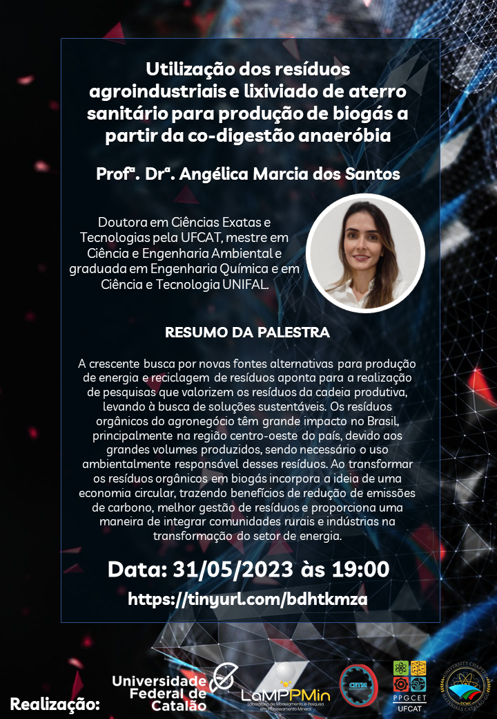 A coordenação do Curso de Especialização em Tratamento de Minérios (CETM), Laboratório de Modelamento e Pesquisa em Processamento Mineral (LaMPPMin) e do Programa de Pós-graduação em Ciências Exatas e Tecnológicas (PPGCET), convida a todos para participarem da palestra intitulada "Utilização dos resíduos agroindustriais e lixiviado de aterro sanitário para produção de biogás a partir da co-digestão anaeróbia", a ser ministrada pela Profa. Dra. Angélica Marcia dos Santos. Haverá emissão de certificados. Link para a palestra https://tinyurl.com/bdhtkmza